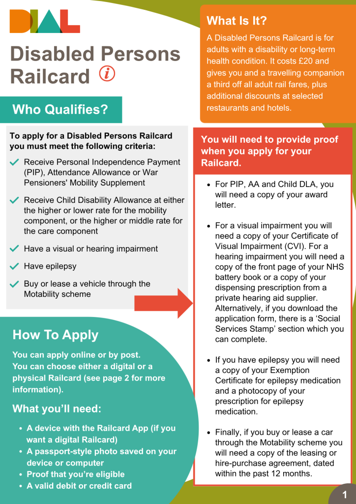 A Disabled Persons Railcard is for adults with a disability or long-term health condition. It costs £20 and gives you and a travelling companion a third off all adult rail fares, plus additional discounts at selected restaurants and hotels.